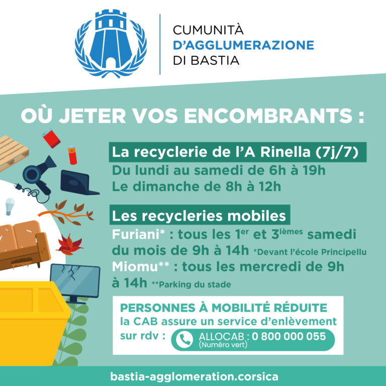 • Dans les recycleries mobiles de Miomu tous les mercredis de 9h à 14h et de Furiani (parking de l’école Principellu) tous les 1er et 3ème samedis du mois de 9h à 14h.